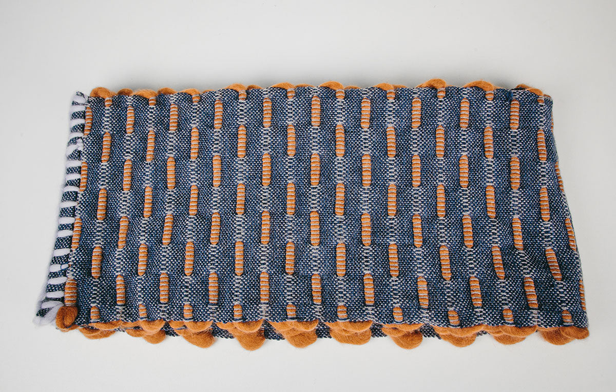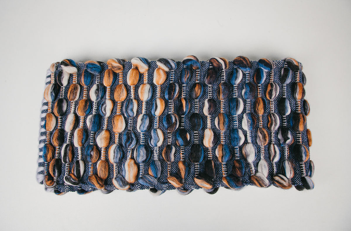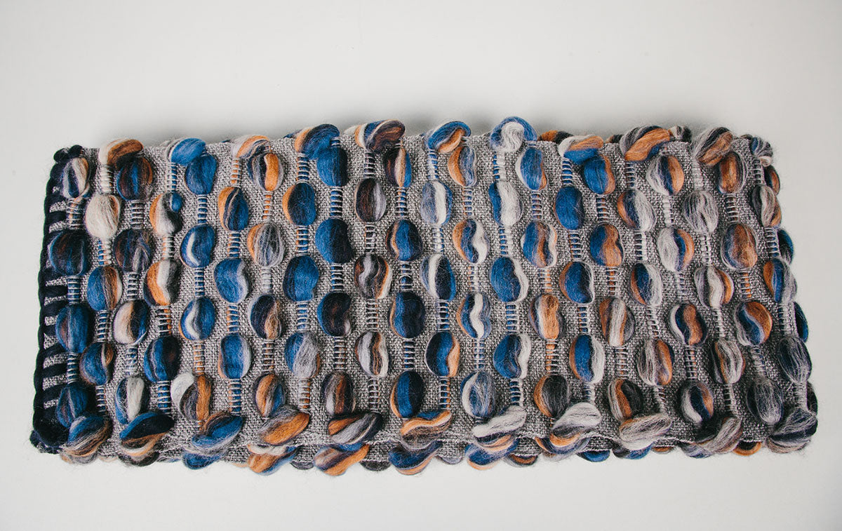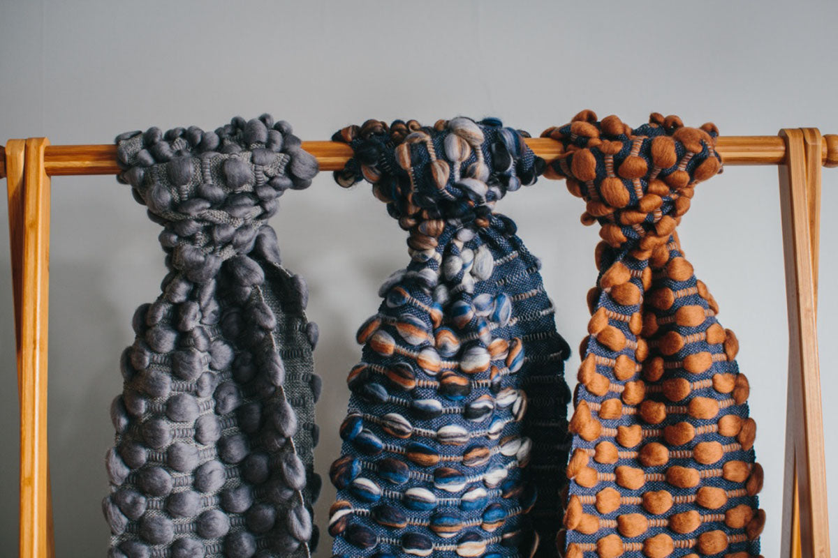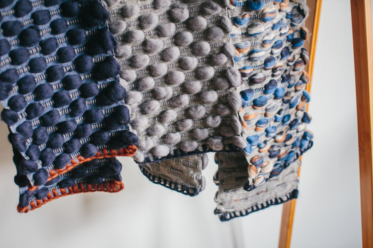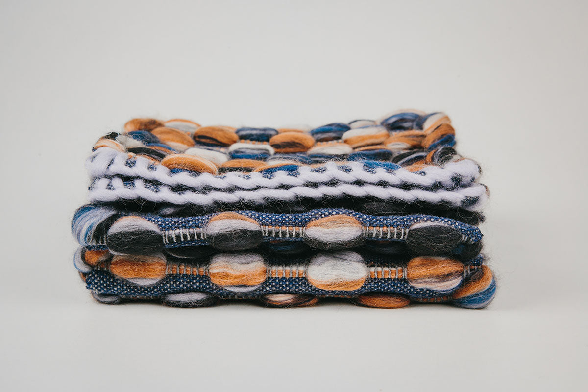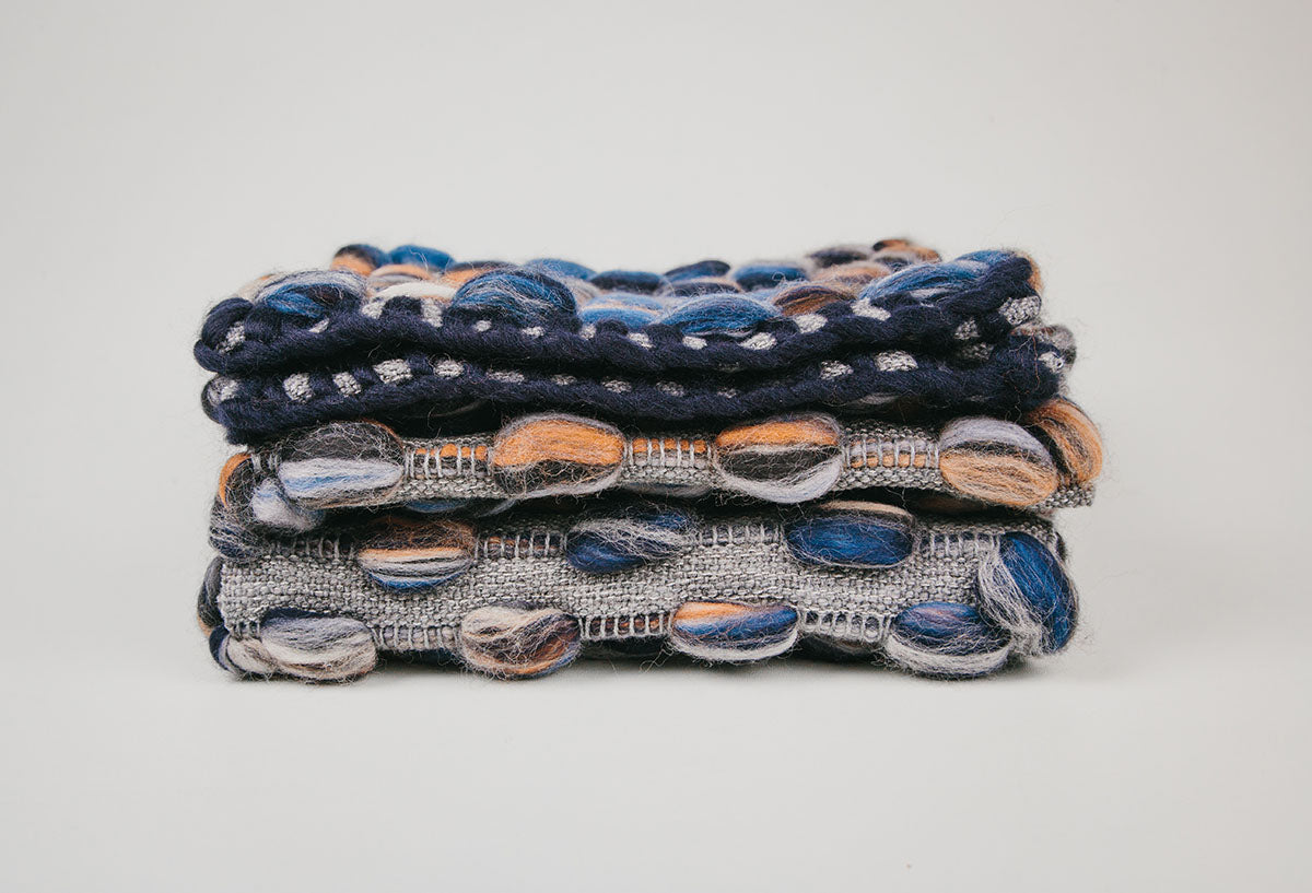 Our 'Ripples' scarf is 100% handwoven in a pattern evoking images of ripples in the sand. Combining weaving and felting techniques and materials, we mix merino wool and cotton yarns together to add depth, hand feed 20m lengths of wool roving through the warp to add texture, hand wash the finished piece to create our unique ripple effect followed by a blanket stitch in a contrasting colour for a finished look. Each step in our process reflects our commitment to craftsmanship and time-honoured weaving traditions. We also believe in sourcing all our materials from within the UK to minimise our carbon footprint and use natural fibres whenever possible as we aim to cultivate a more sustainable practice.